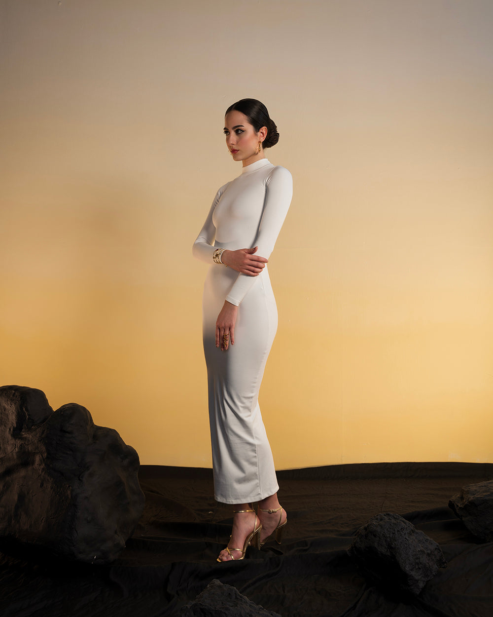 Snowy white full-length bodycon dress tailored to enhance your curves. Walk down the ramp with our tasteful luxe collection curved to a cutout back.